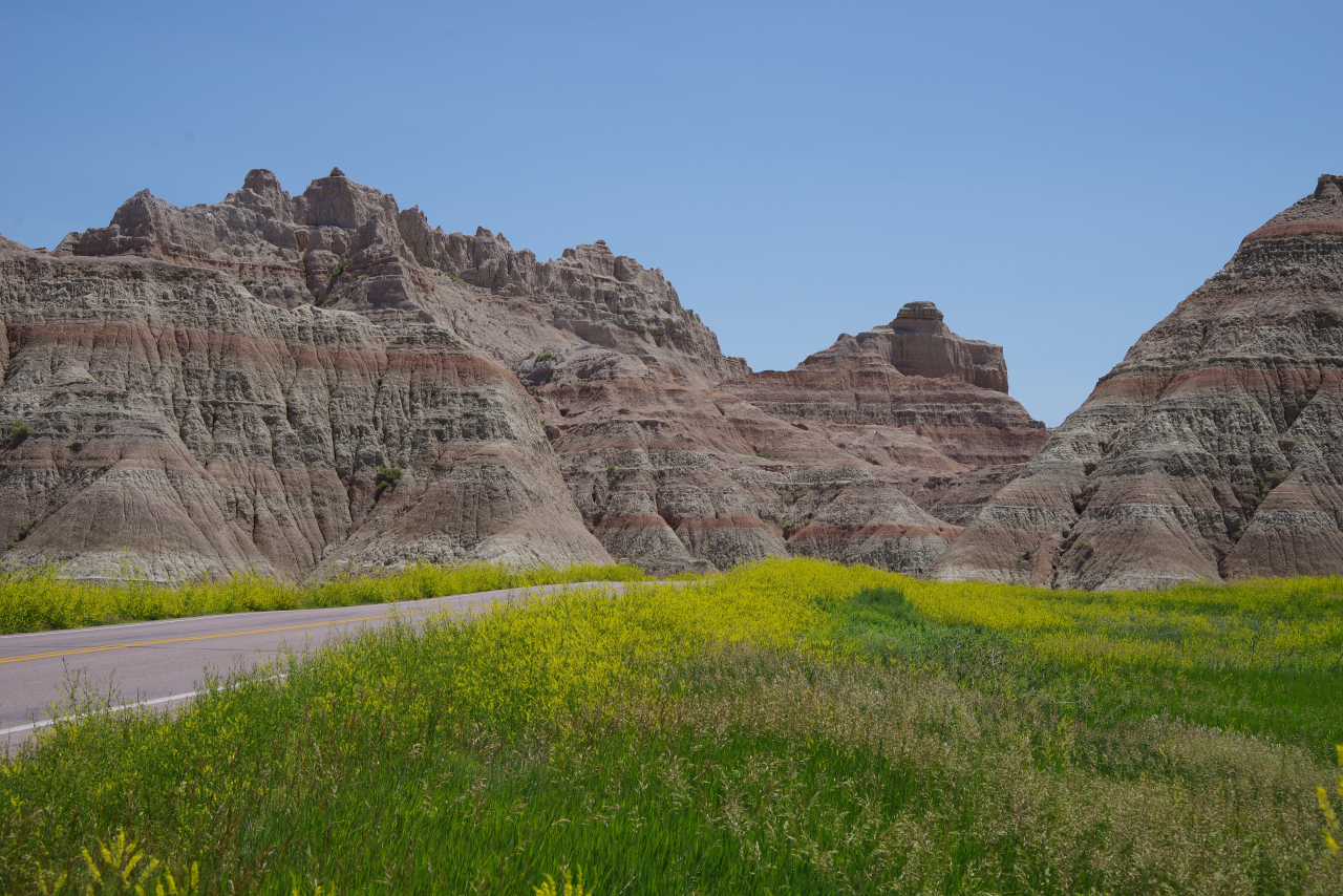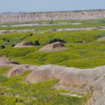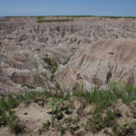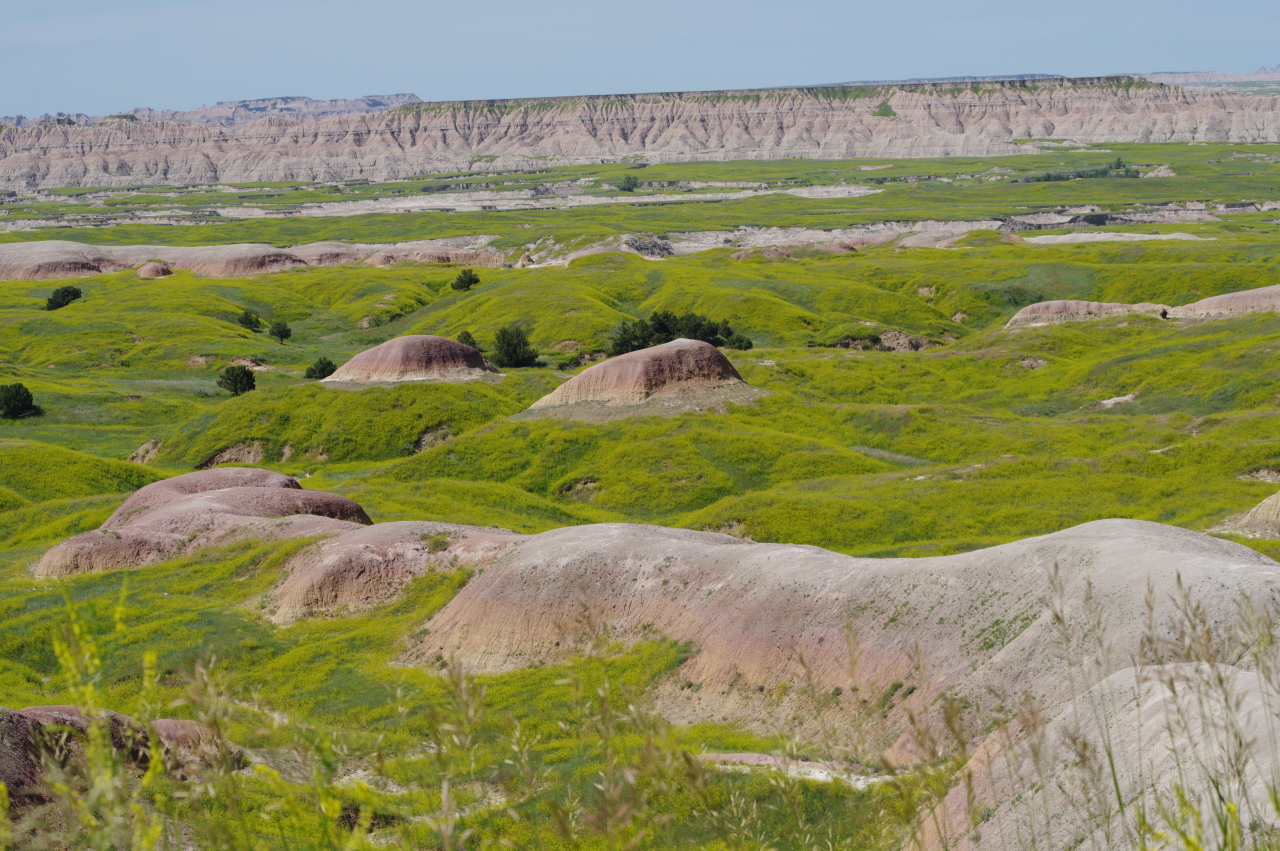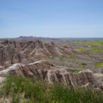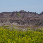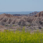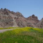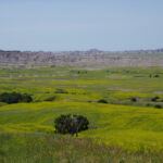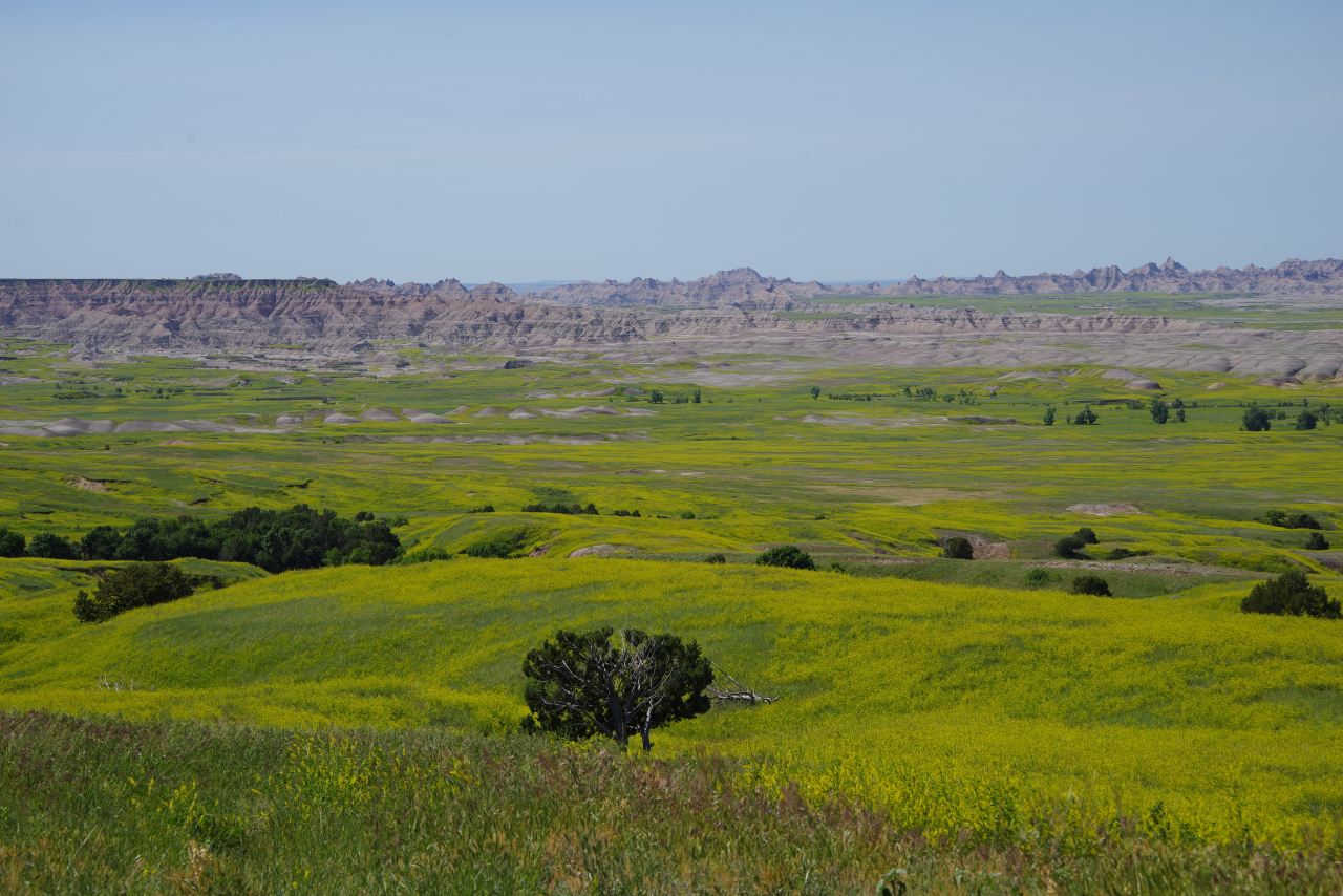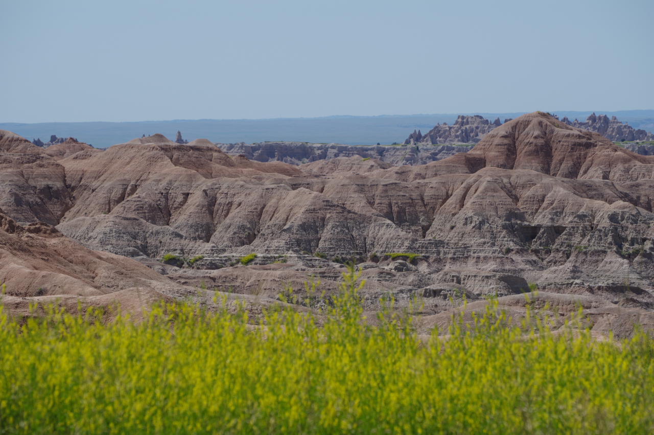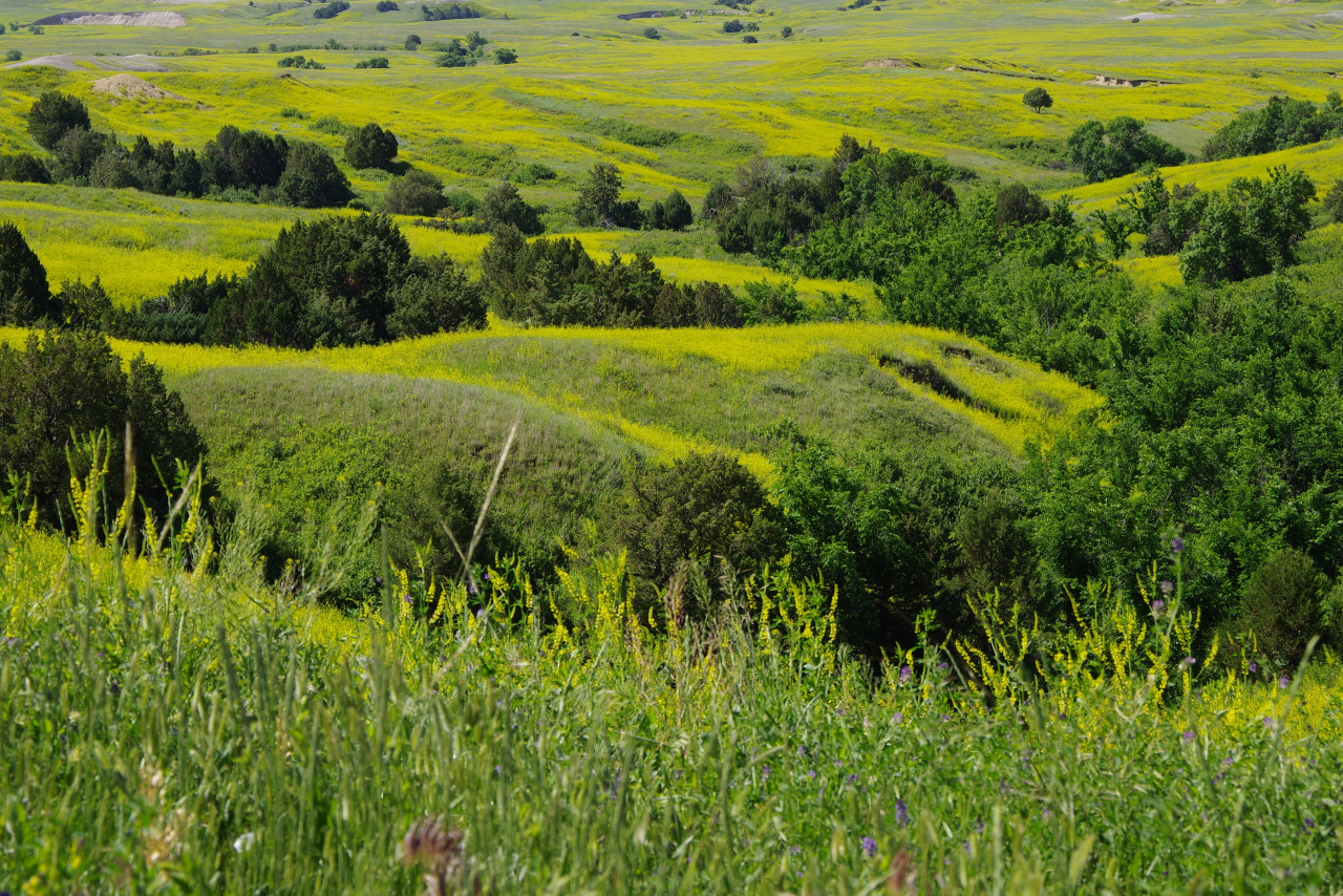 Zoals eigenlijk alle parken die we in de loop der jaren hebben bezocht, heeft ook dit park een geheel eigen karakter en lijkt het op geen van de andere. Het landschap en de rotsformaties zijn weer helemaal anders. Erg ge-erodeerd en veel rotsen lijken vanaf een afstand een soort olifantshuid te hebben qua kleur en aanblik. Er zijn uitgebreide heuvelachtige gebieden met afwisselend gras en hele velden planten met gele bloemen waarvan we later in het Visitor Center leerden dat ze niet inheems zijn en langzamerhand alles overwoekeren. Er zijn hele stukken waar je afgezien van rotsen niets anders meer ziet dan deze planten, die nu ook nog allemaal bloeien. De naam is Yellow Sweet Clover (honingklaver) . Het is een erg bijzonder landschap maar of je als staat blij moet zijn met zo’n exoot….