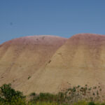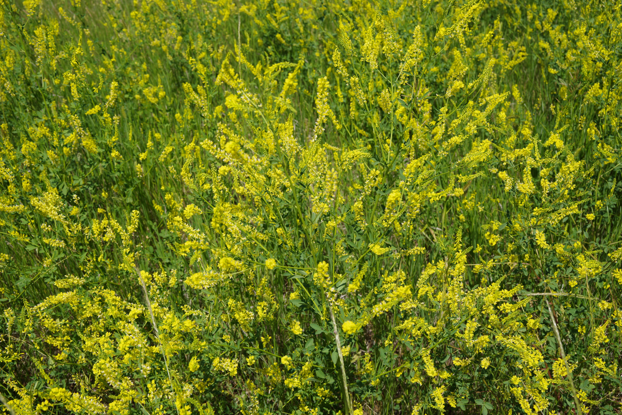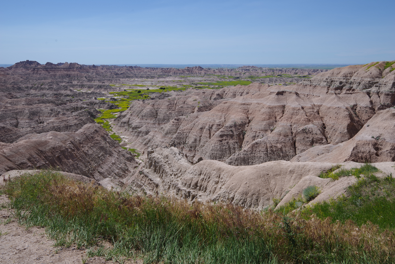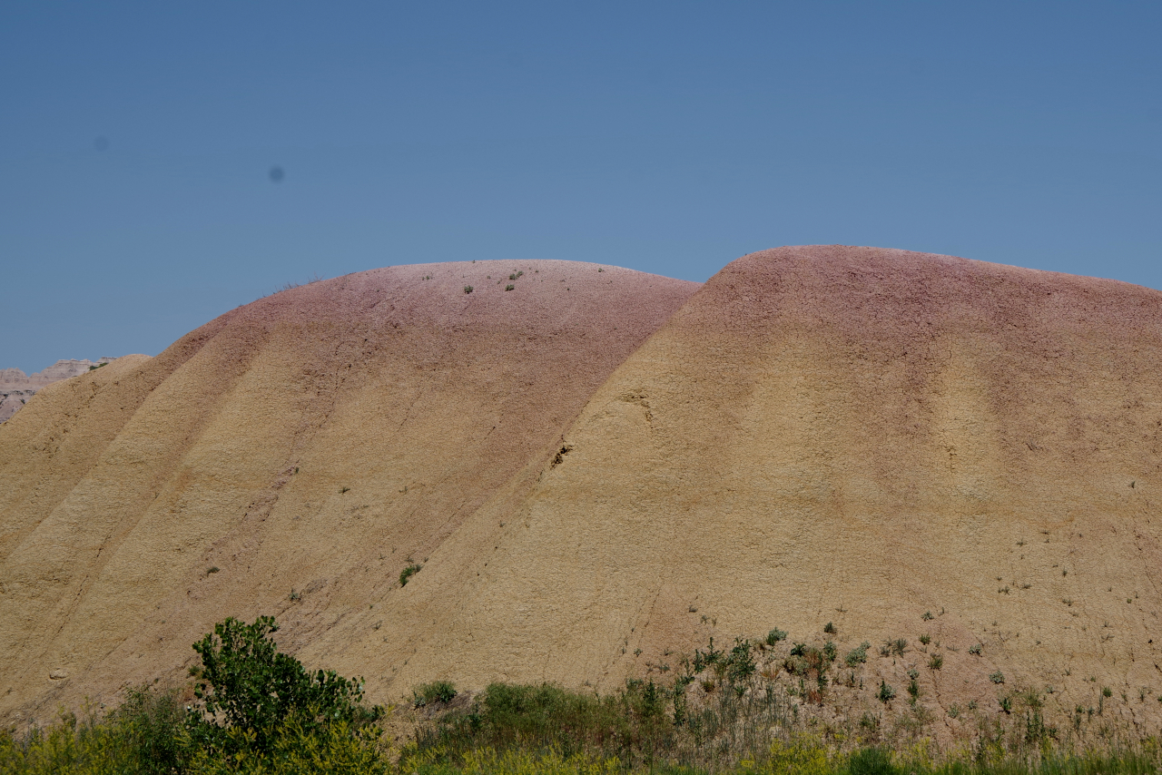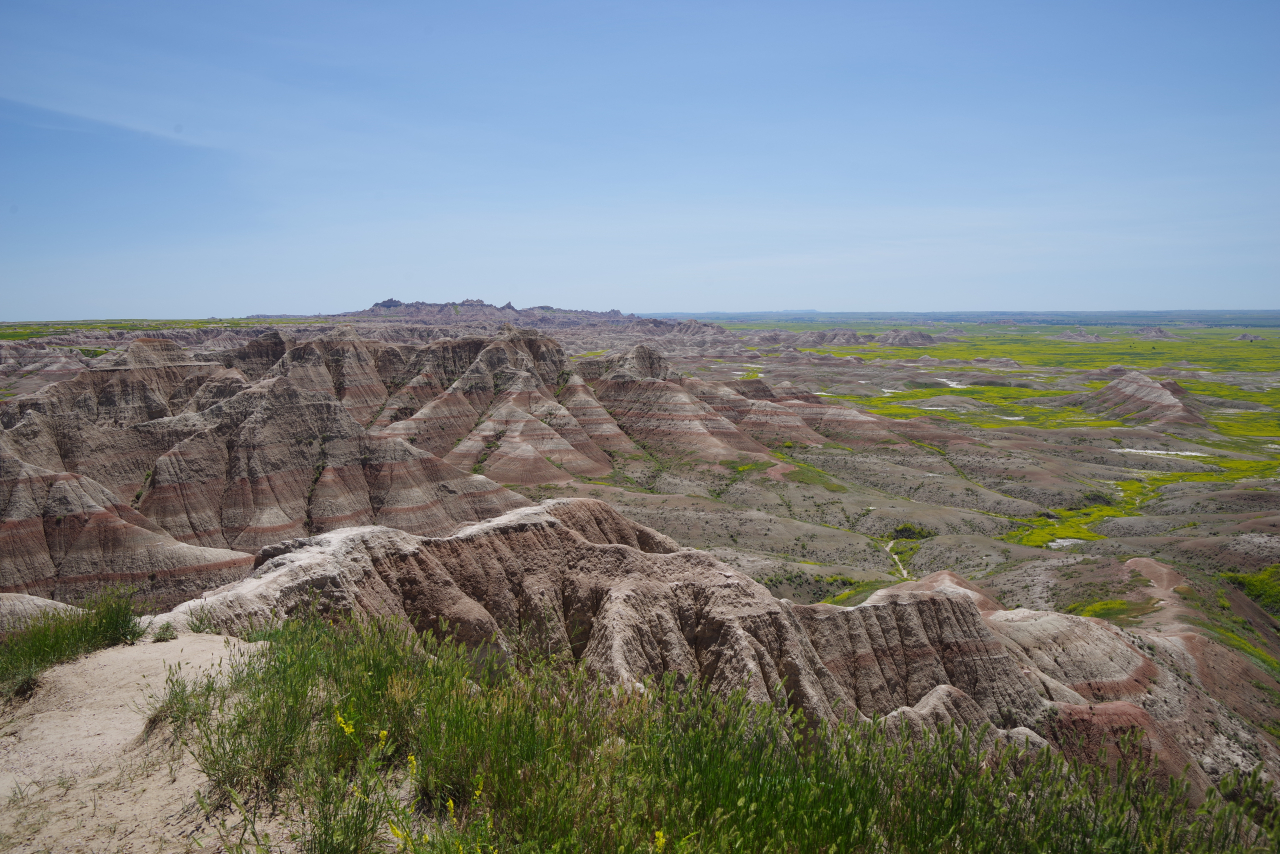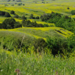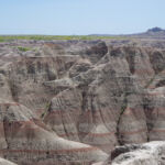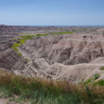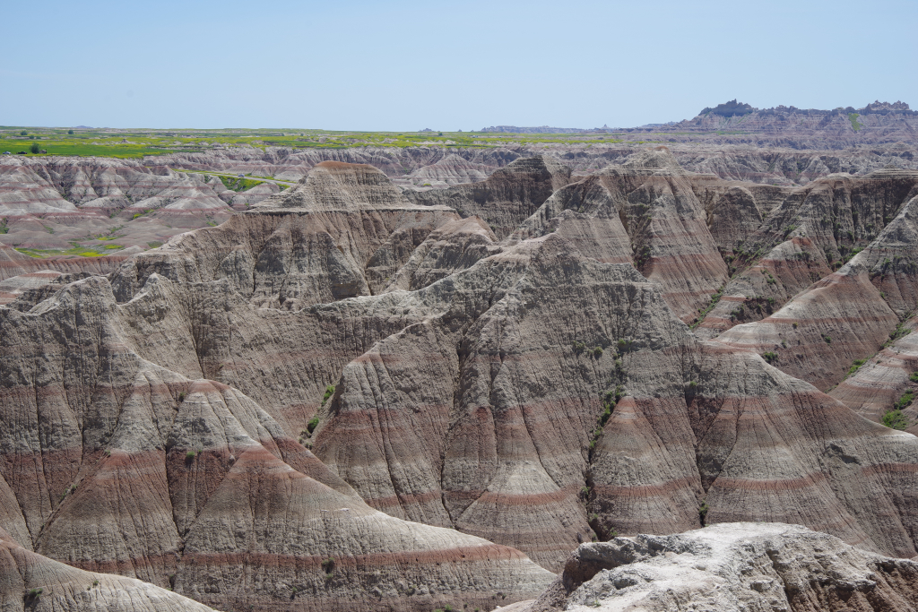 Zoals eigenlijk alle parken die we in de loop der jaren hebben bezocht, heeft ook dit park een geheel eigen karakter en lijkt het op geen van de andere. Het landschap en de rotsformaties zijn weer helemaal anders. Erg ge-erodeerd en veel rotsen lijken vanaf een afstand een soort olifantshuid te hebben qua kleur en aanblik. Er zijn uitgebreide heuvelachtige gebieden met afwisselend gras en hele velden planten met gele bloemen waarvan we later in het Visitor Center leerden dat ze niet inheems zijn en langzamerhand alles overwoekeren. Er zijn hele stukken waar je afgezien van rotsen niets anders meer ziet dan deze planten, die nu ook nog allemaal bloeien. De naam is Yellow Sweet Clover (honingklaver) . Het is een erg bijzonder landschap maar of je als staat blij moet zijn met zo’n exoot….