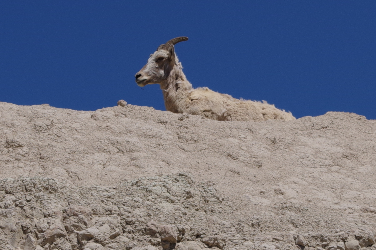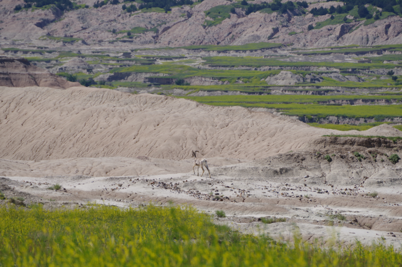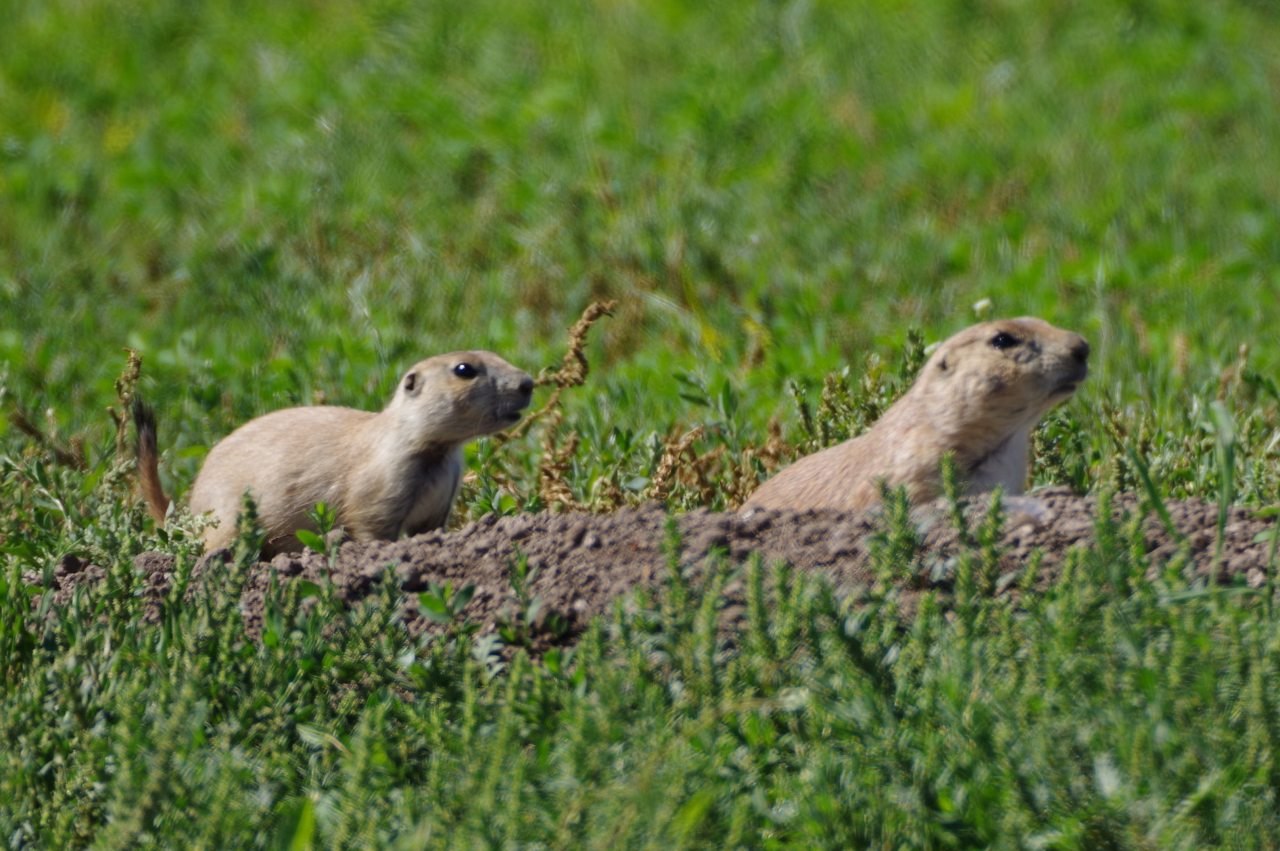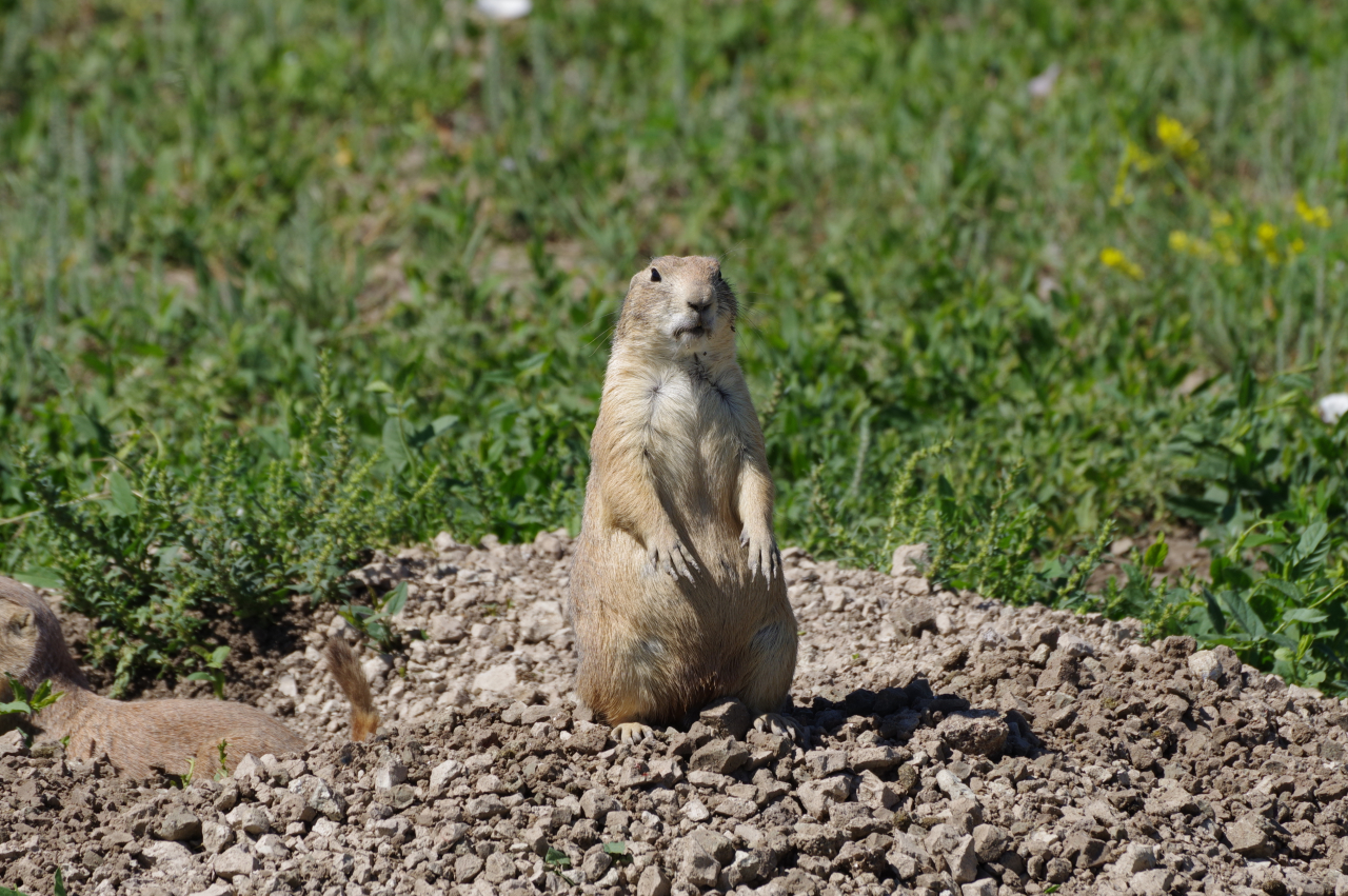 In de verte zagen we regelmatig dieren lopen; bisons, herten, schapen. Later zagen we dichter langs de weg hele kolonies prairie dogs die staand op hun achterpootjes de passerende bezoekers in de gaten hielden.