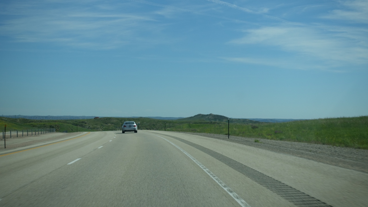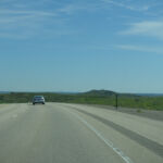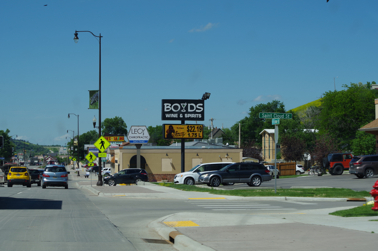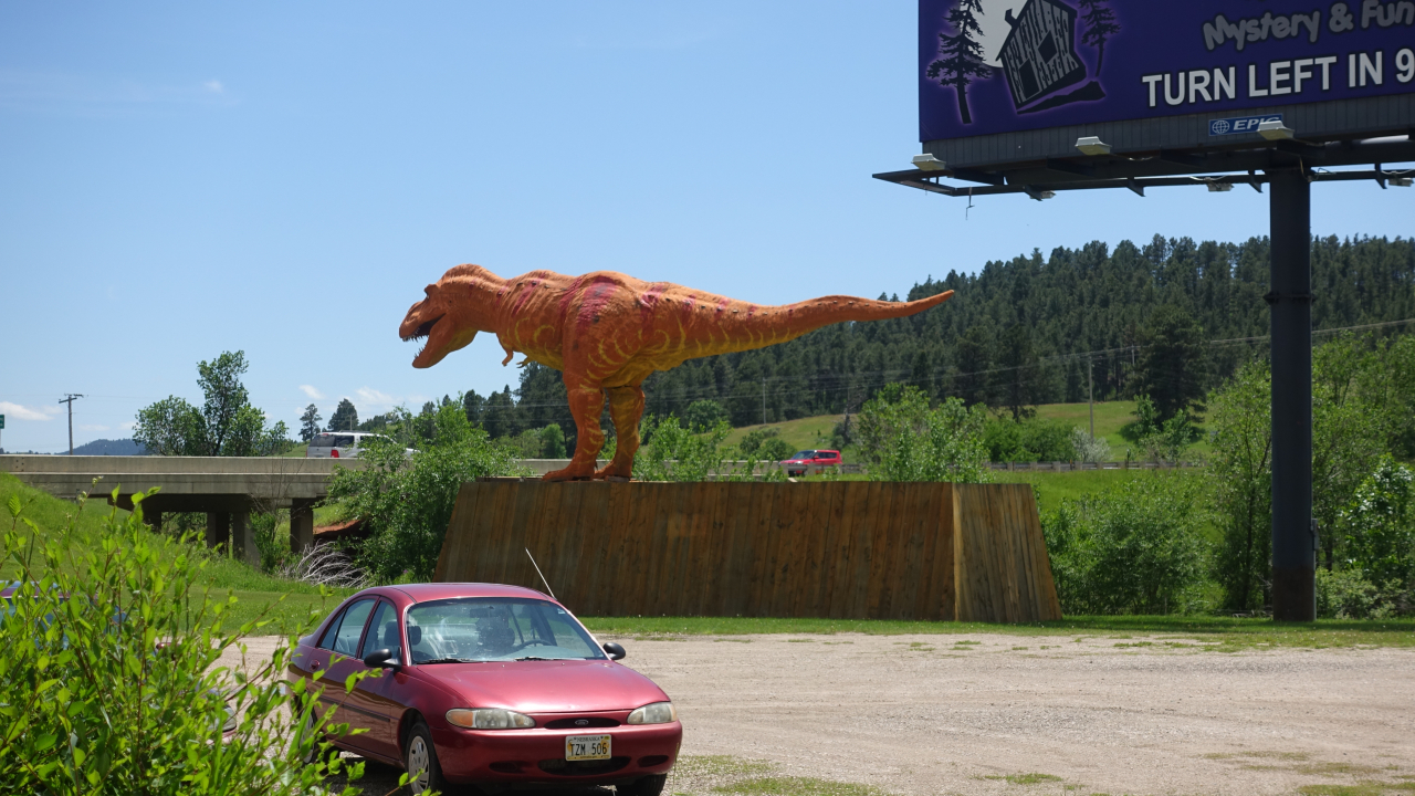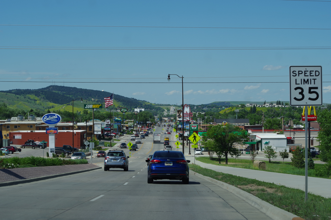 De weg van Buffalo naar Rapid City gaat volledig over de Interstate I90 East. De snelheid op deze weg is vrijwel overal 80 Mph, en stoppen is streng verboden. En ze staan er echt, die autootjes van de Highway police, net verscholen achter een heuveltje, klaar om overtreders direct in de kraag te grijpen. Dat risico willen we niet lopen. Dus weinig foto’s van onderweg. Het landschap was ook lang niet zo afwisselend als gisteren. Voornamelijk heuvelachtig met gras en soms een stuk wild koolzaad en weinig bomen. Het was niet druk op de weg dus we konden goed opschieten en waren al om 13.00 op de plaats van bestemming. Veel te vroeg om al in ons hotel in te checken.