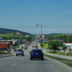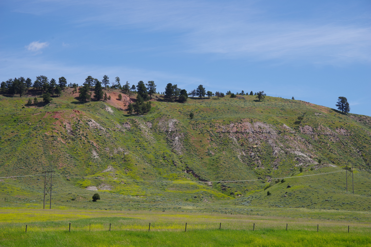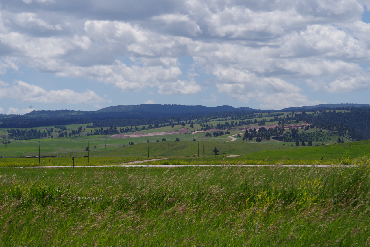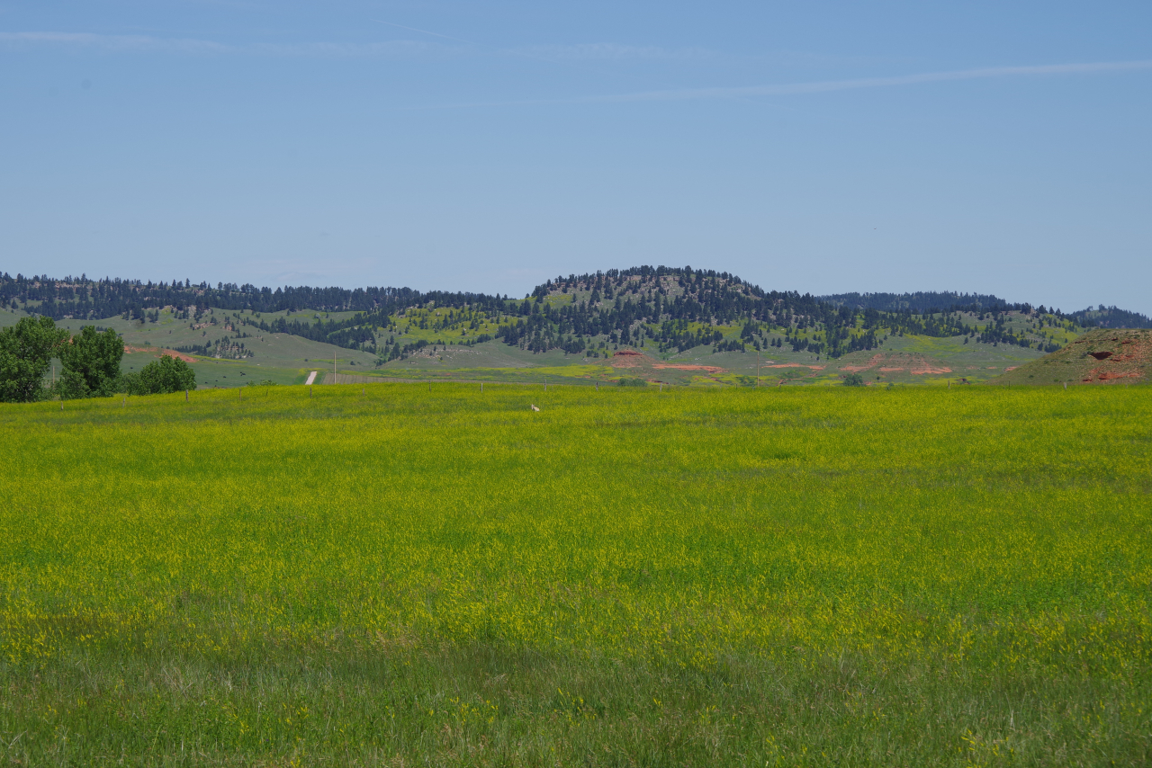 De weg van Buffalo naar Rapid City gaat volledig over de Interstate I90 East. De snelheid op deze weg is vrijwel overal 80 Mph, en stoppen is streng verboden. En ze staan er echt, die autootjes van de Highway police, net verscholen achter een heuveltje, klaar om overtreders direct in de kraag te grijpen. Dat risico willen we niet lopen. Dus weinig foto’s van onderweg. Het landschap was ook lang niet zo afwisselend als gisteren. Voornamelijk heuvelachtig met gras en soms een stuk wild koolzaad en weinig bomen. Het was niet druk op de weg dus we konden goed opschieten en waren al om 13.00 op de plaats van bestemming. Veel te vroeg om al in ons hotel in te checken.