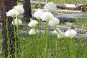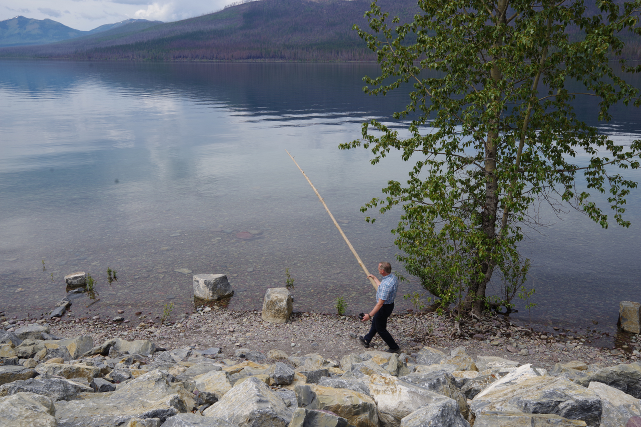 Alternatief zou zijn om naar de noordelijke ingang te rijden. Volgens Russ, een van de mede fotografen, is die kant ook mooier. Maar om daar nou ruim 300 mijl voor in de auto te zitten. Dat hadden we er niet voor over. We rijden al genoeg en het was sowieso al een extraatje dat we iets van het park konden zien, doordat we de reservedag voor de fotoworkshop niet nodig hadden. Lake McDonald was zeker de moeite waard en we hebben mooie stroomversnellingen gezien. Zie de foto’s. De witte bloemen heten Bear Grass en ze bloeien overal in het park. Wat Tom met die stok van plan was is me niet geheel duidelijk.