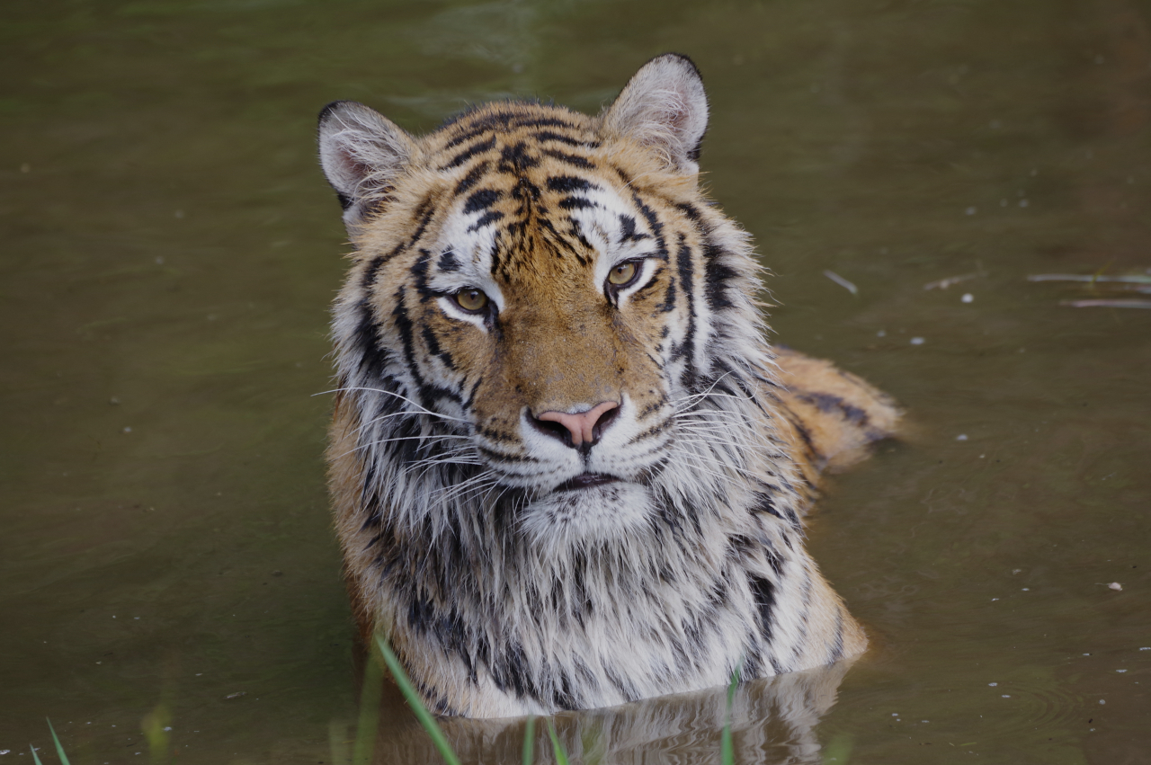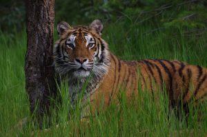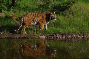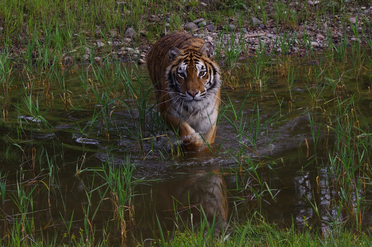 Om half 7 vanmorgen vertrokken we naar een nieuwe locatie, voor de fotosessie met een tijger. Slechts van ons gescheiden door een hekje van amper een meter hoog en een lijntje schrikdraad waar ze met gemak over heen springt. Maar gelukkig was ze totaal niet in ons geinteresseerd. Ze begon met rustig de grenzen van het terrein te verkennen. Daarna sprong ze in het water en plonsde daar wat rond en at wat van het gras. Aangespoord door Heather wilde ze ook wel door het water op ons af te rennen. Niet helemaal tot het hek gelukkig. Het is wel een belevenis on door de zoeker van je camera zo’n enorm beest recht op je af te zien komen. Na de tijger waren op een terreintje even verderop de rode vossen aan de beurt. Twee pubers en hun mama. Het ene jong was overigens zwart. Dat schijnt wel vaker voor te komen.