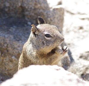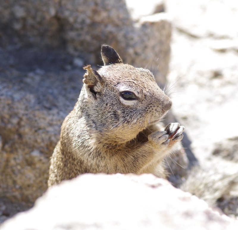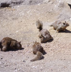 Vanmorgen zijn we aan de andere kant naar Pacific Grove gegaan. In de winter overwinteren hier miljoenen Monarchvlinders, maar nu was er geen te zien. Evengoed hadden we een hele leuke ontmoeting. Bij een groepje rotsen zagen we allemaal eekhoorns, die helemaal niet schuw waren. Ze kwamen gewoon naar ons toe. Toen even later een ouder echtpaar op een bankje ging zitten, bleek waarom. Ze hadden een grote zak voer bij zich en binnen de kortste keren waren ze omsingeld door tussen de 10 en 15 eekhoorns die zelfs tegen hun broekspijpen omhoog klommen. Ze hebben wat van hun voer met ons gedeeld. Zo leuk. Sommigen stopten hun wangzakken vol en renden dan hun hol tussen de rotsen is om de boel te dumpen en terug te rennen voor een nieuwe portie. Anderen bleven zitten en aten alles ter plekke op.