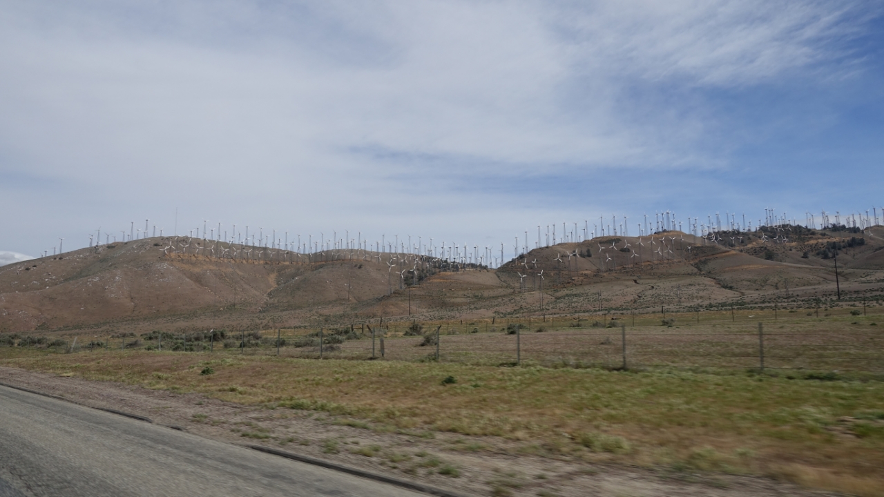 Vanmorgen na het ontbijt zijn we begonnen aan de lange rit naar Ridgecrest. Met ongeveer 425 km 1 van de langste trajecten. Het eerste deel ook nog bochtige bergwegen en dan nog een stuk tweebaansweg langs wederom weilanden en fruitplantages. Dan een groot stuk 4 baans highway waar je lekker op kunt schieten. Het landschap wordt steeds droger. We komen langs grote velden met zonnepanelen en later ook ‘een paar’ windmolens. Bij het plaatsje Oildale staan aan beide kanten van de weg tientallen ja-knikkers olie op te pompen. Inmiddels is het steeds harder gaan waaien, met windstoten van 65km per uur. Overal stuift zand. We hebben nog even wat water en proviand ingeslagen voor de lange rit morgen, via Death Valley naar Las Vegas. Omdat het in Death Valley erg heet kan zijn hebben we een koelbox en wat ijselementen gekocht om mijn stomaplakken en pastaringen koel te houden. Volgens de weersvoorspelling wordt het morgen daar trouwens maar 30 graden. Vandaag was het 37 graden. Evengoed wordt het snel warm in de auto als die stilstaat.