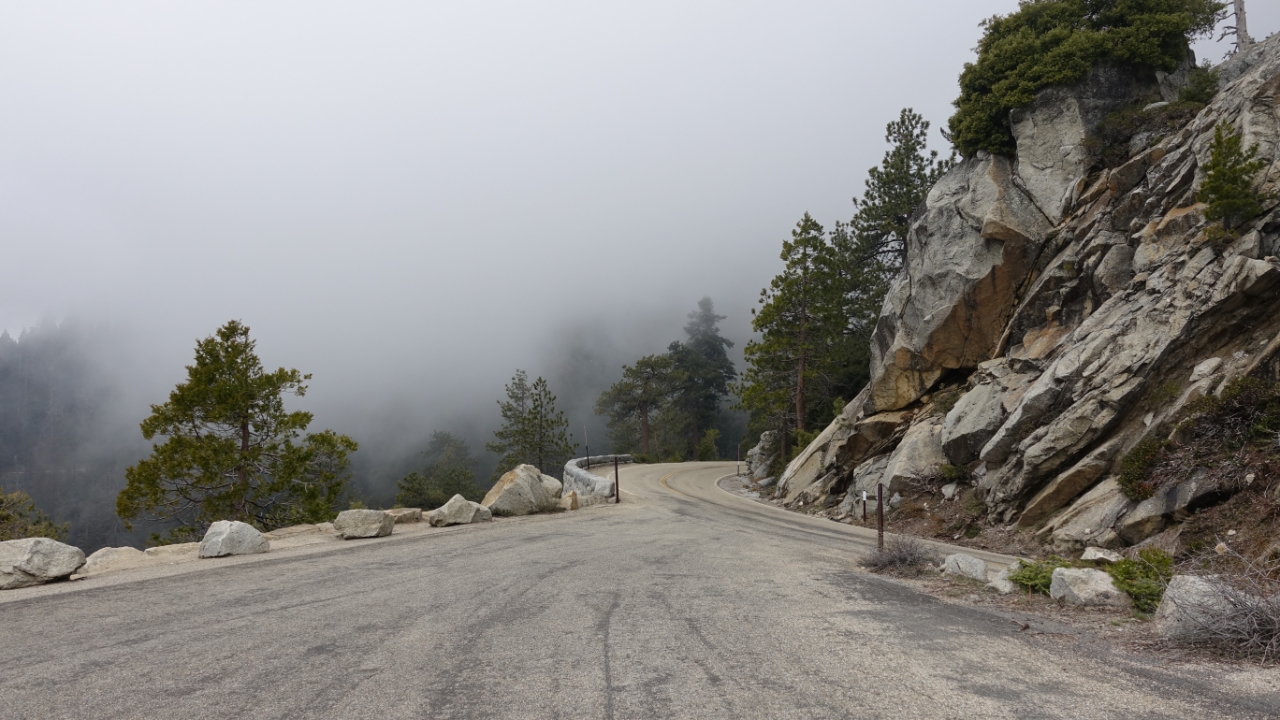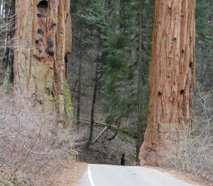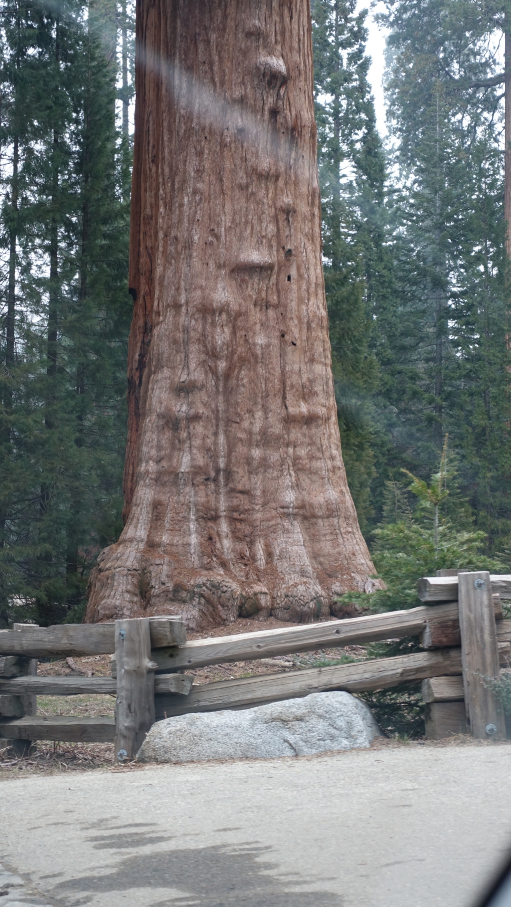 Totdat we ineens net op een heel steil en bochtig stuk zo de dichte mist inreden. Het kunnen trouwens ook wel laaghangende wolken zijn geweest. Over een lengte van ongeveer een kilometer een zicht van minder dan 10 meter volgens Tom. Volgens mij minder dan 5 meter, maar dat kon ook door mijn van angst bijna dichtgeknepen ogen zo lijken. 😉 Doodeng vond ik het. Het enige positieve was dat ik behalve de weg ook de afgrond niet meer kon zien. Gelukkig klaarde het later op. We hebben nog wel kleine mistveldjes gehad maar niet meer zoals dit. Aan het begin van de middag zagen we de eerste grote Sequoia, de General Grant Tree. Er loopt een wandelpad omheen waar je nog meer van deze reuzen tegenkomt. Ook onderweg naar de lodge waar we zouden overnachten zagen we er diverse. Heel indrukwekkend. Niet alleen de dikte maar ook de hoogte. Zelfs met mijn groothoeklens was het lastig om ze helemaal op de foto te krijgen.