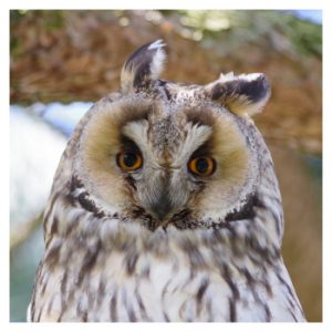 “s Middag liep ik weer even de tuin in om te kijken, toen mijn man ze:i: ’Hij zit nu in de Koreaspar’. ‘Nee hoor, hij zit nog gewoon op dezelfde plek’, antwoordde ik. Er bleek dus een tweede uil te zijn, ditmaal een vrouwtje. Ze hebben er de hele dag gezeten, af en toe roepend naar elkaar. Het vrouwtje was schuwer dan het mannetje, dat het gedoe om hem heen met belangstelling volgde.Je kunt het op de foto’s zien aan de manier waarop haar oren helemaal omhoog staan.